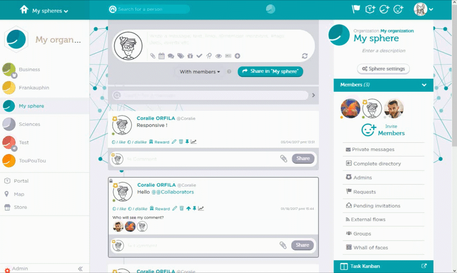 You can access each sphere separately, just like on the web version, with the same colours, logo and features. Use the app to share live videos or photos from events or surveys.